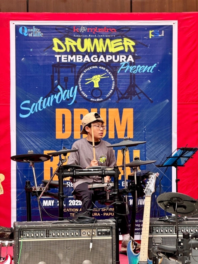 Adina, a fourth-grade girl drummer at the Yayasan Pendidikan Jayawijaya (YPJ), was one of the drummers who performed at the recital last May. "Adina has been learning drums for a semester. "Learning drums is so much fun," she said, her eyes sparkling. "During the recital, I played the song'Yellow' and 'Best Day of My Life," she continued proudly.